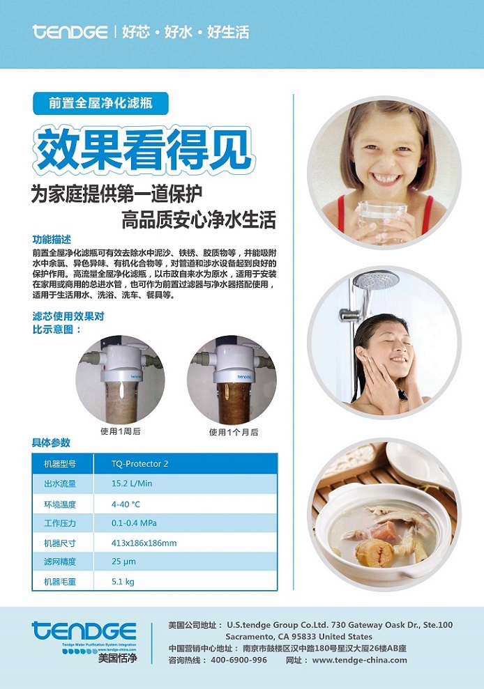 恬凈前置全屋凈化濾瓶TQ-P2能有效去除水中的懸浮物、鐵銹、顆粒雜質(zhì)、余氯、異色異味,它采用FDA食品級(jí)材質(zhì),高精度過濾濾芯,體積小巧,安裝方便。恬凈前置全屋凈化濾瓶TQ-P2能承受高水壓,流量超大,智能濾芯提醒功能,節(jié)能環(huán)保。