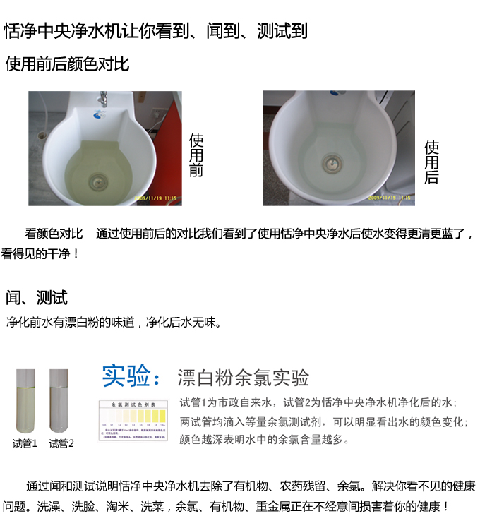 全自動中央凈水機(jī)有效去除水中的異色、異味;進(jìn)一步濾除水中微小雜質(zhì)、膠狀體;去除水中的漂白粉余氯、農(nóng)藥、重金屬;保留對人體有益的礦物質(zhì)。使水變得碧清、碧藍(lán),去除對人體有害的物質(zhì)。